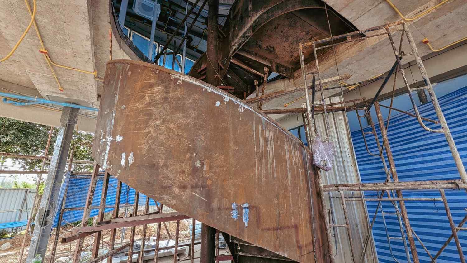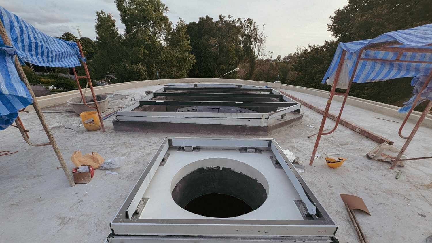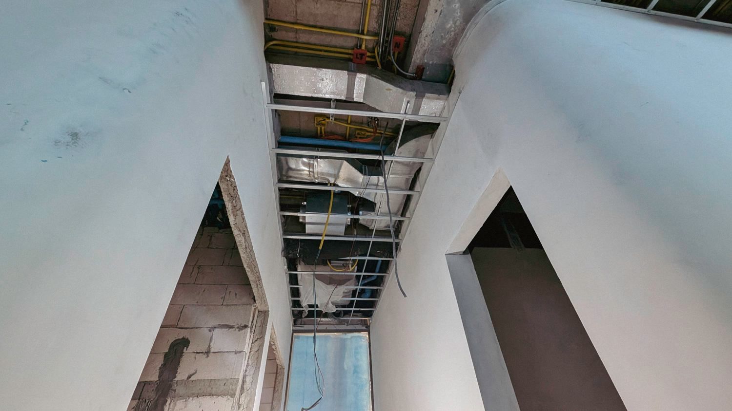 Completed the installation of external air conditioning units on the roof and preparation of internal walls for underpainting. Assembled the spiral metal staircase and began work on painting. Poured the screed with a slope on the terrace and applied penetrating waterproofing. Installed glazing on the facade of the building and installed internal glass partitions. Started tiling the walls of the bathrooms and shower room. Applied decorative sandwash coating to the facade and started installation of the suspended ceiling support frame.