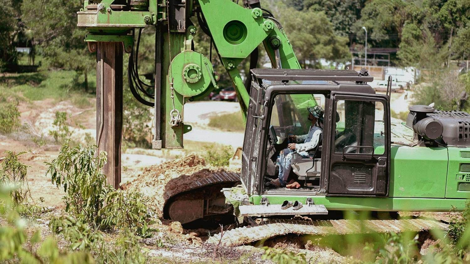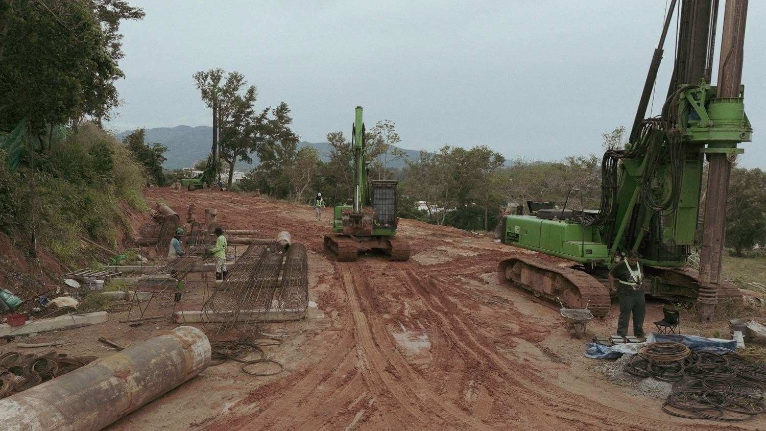 Continue installation of bored piles - 205 piles have been installed. Work continues on excavation, clearing the area for future works, constructing temporary and permanent roads, installing drainage system, and building temporary structures: fencing, wheel washing areas, construction offices.