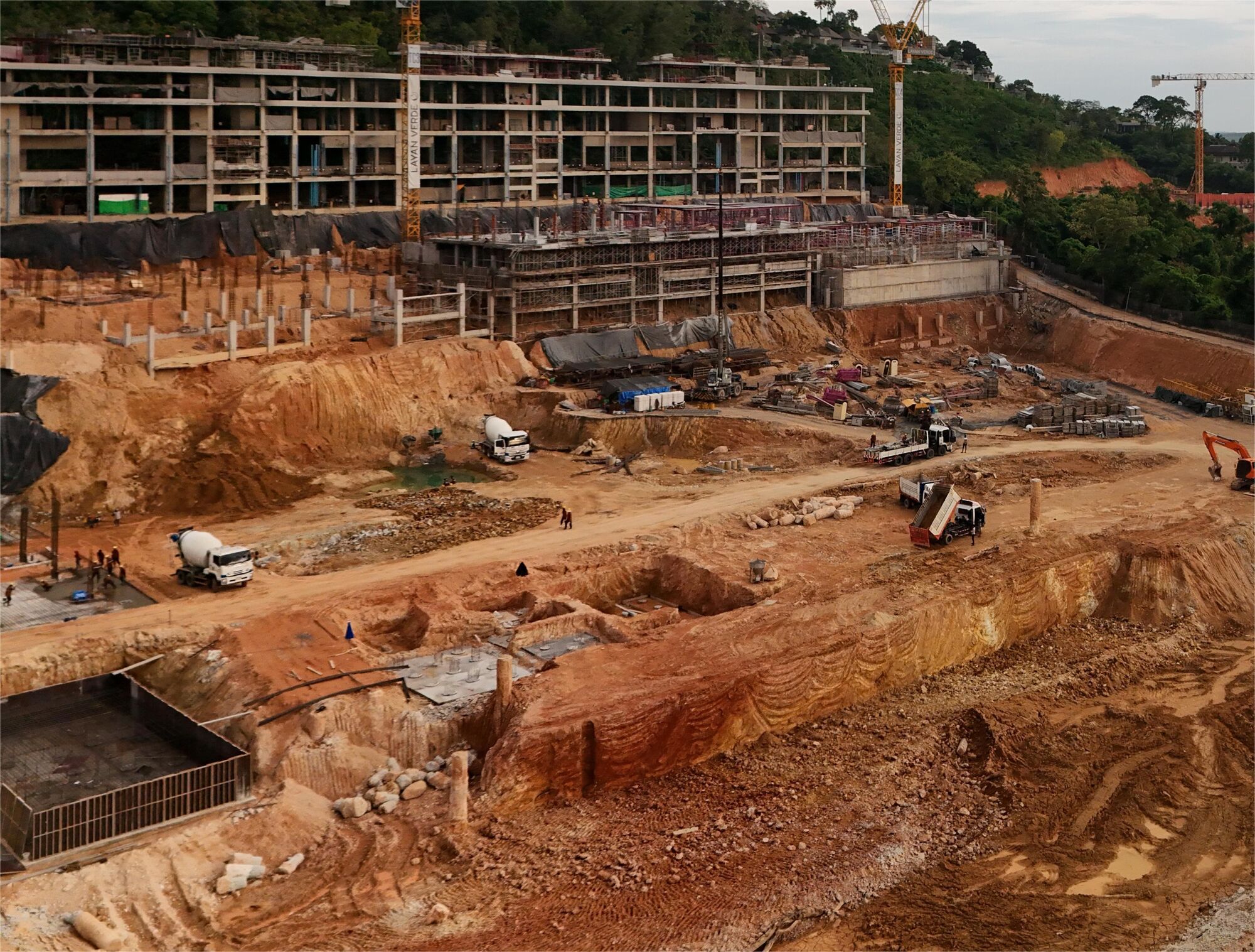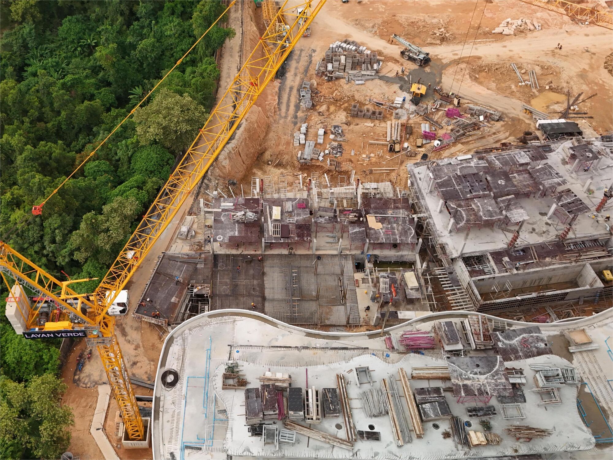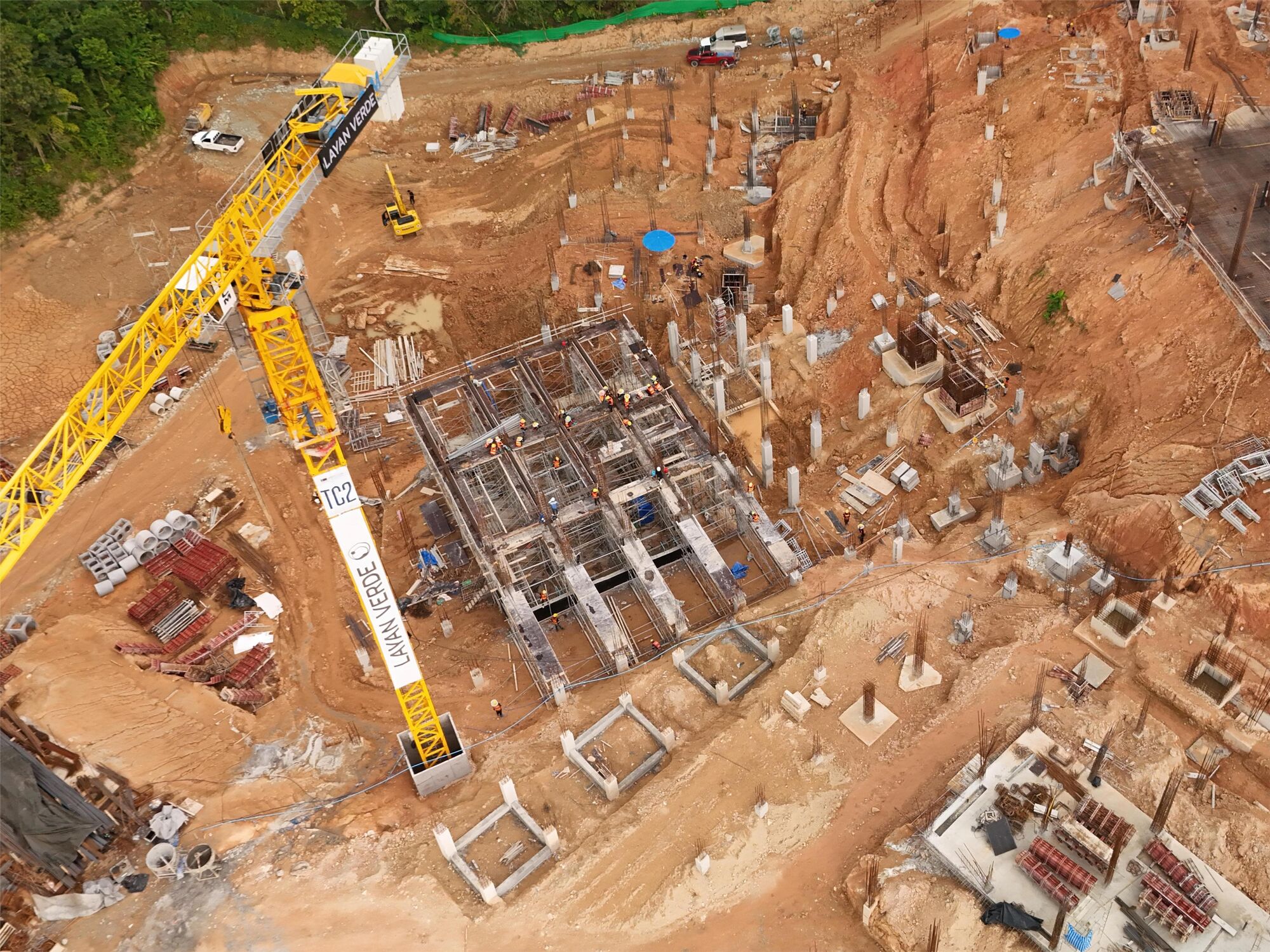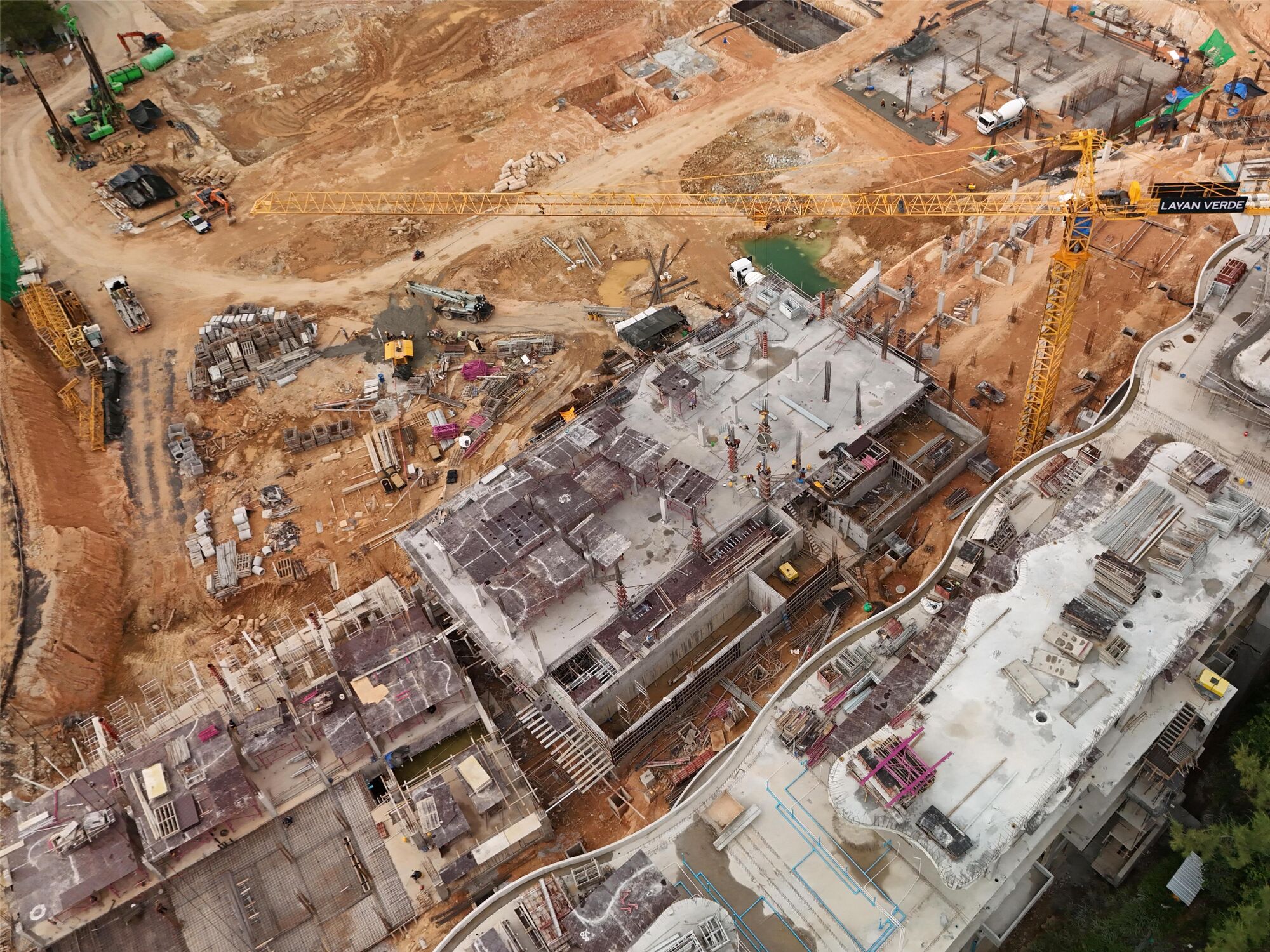 A total of 1,810 piles are installed at the Layan Verde construction site. Soil excavation works continue, with 259,430 m³ removed to date. Installation of plumbing pipelines has commenced in Building A5. Scaffolding installation is underway for the 2nd-floor slab of Building A2.1, and partial casting of the 2nd-floor slab of Building A2.2 is complete. Foundation works continue for Buildings A3, A4, and B8. In Building BM2, foundation construction and slab reinforcement works are ongoing. A total of 7,430 m³ of concrete has been placed for foundations and structural frame elements.