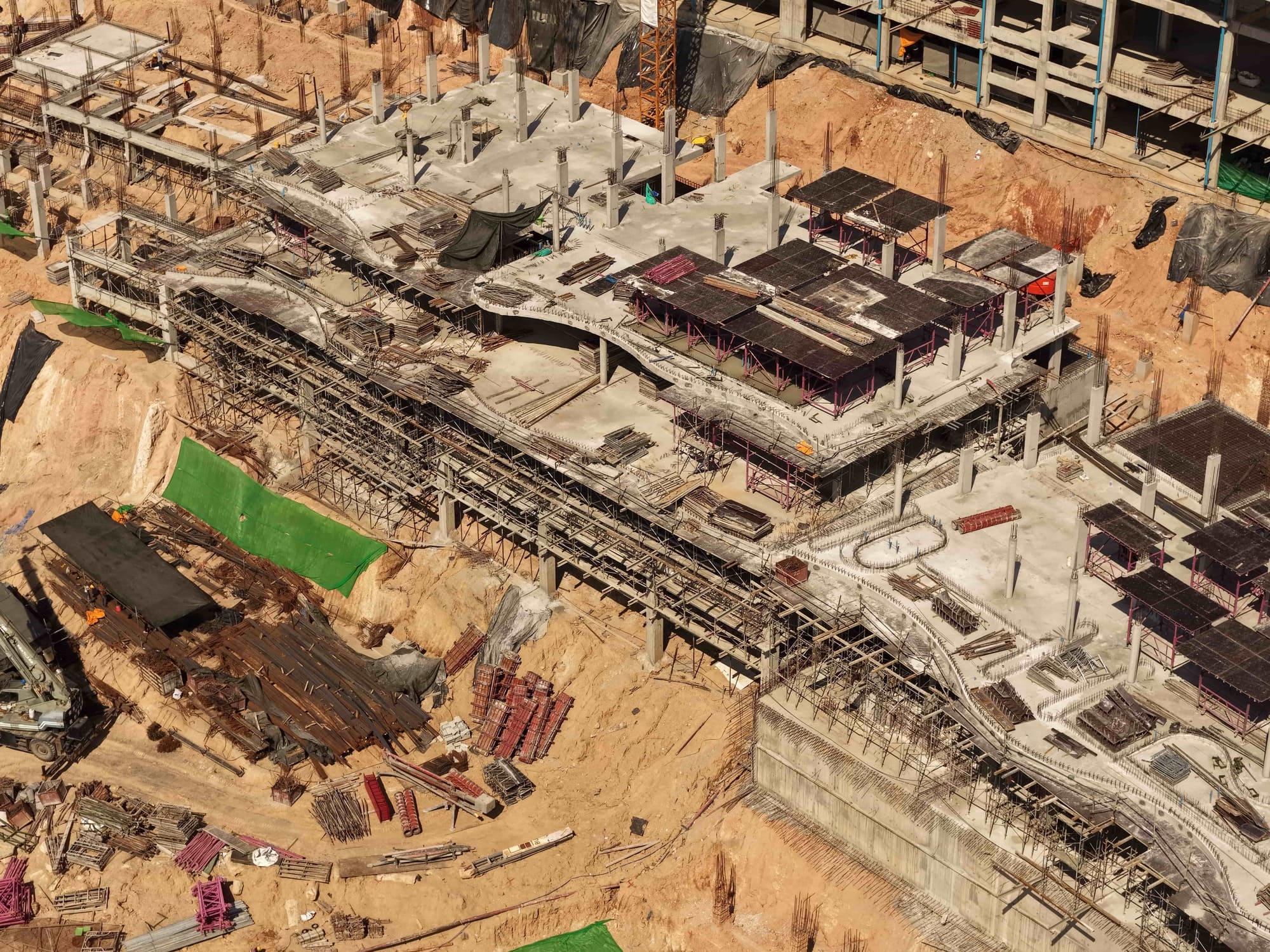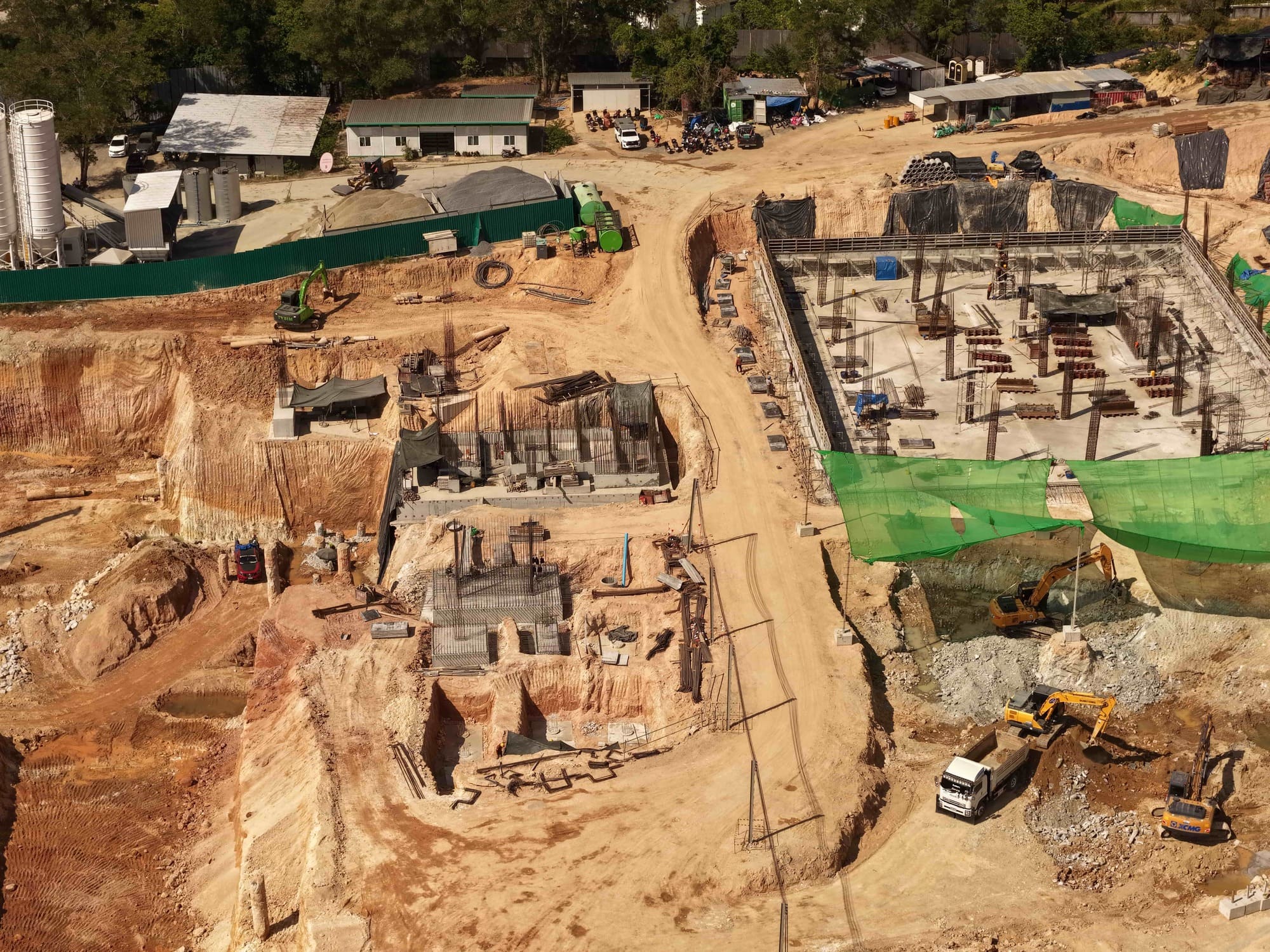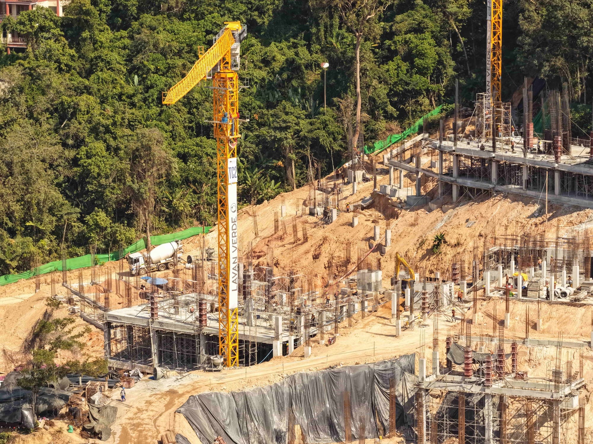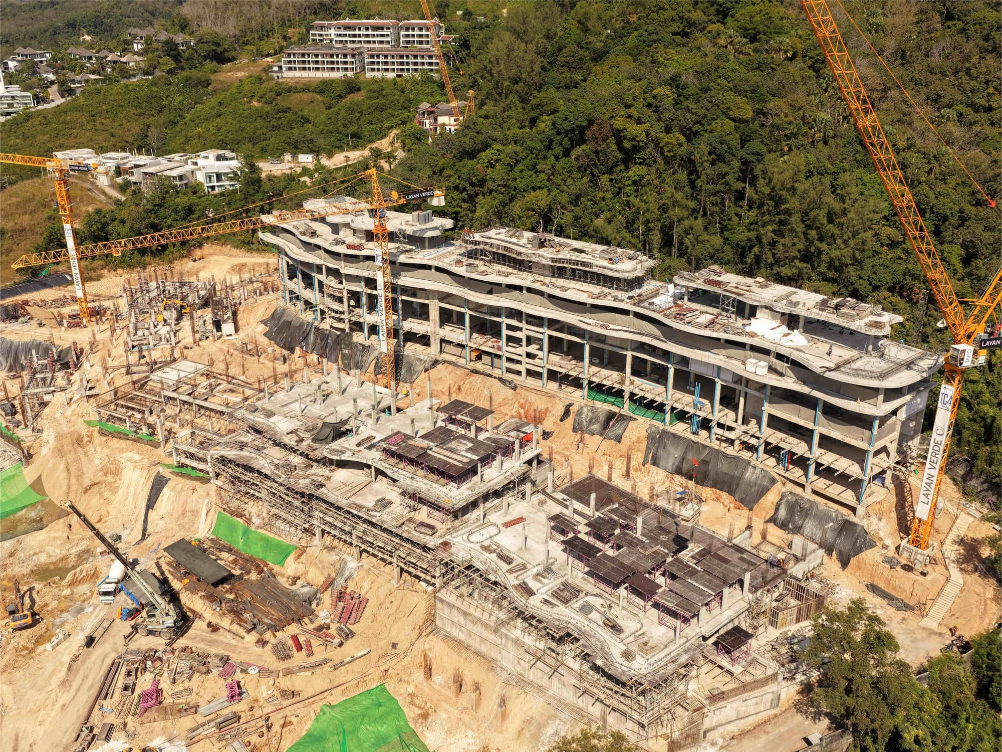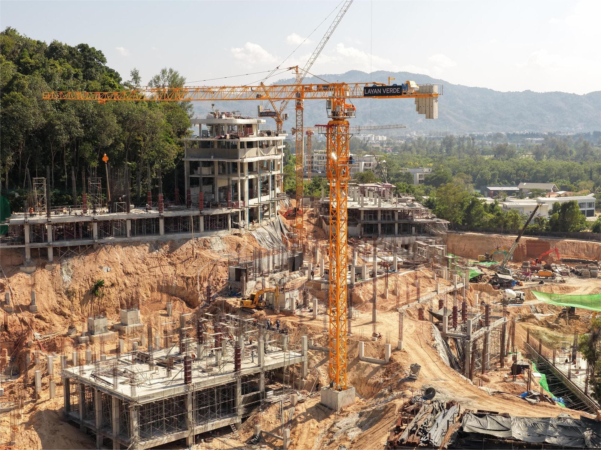 A total of 1,827 piles are installed at the Layan Verde construction site. Soil excavation continues, with a cumulative volume of 281,180 m³ removed. Installation of internal partition walls continues on the 2nd and 3rd floors of Building A5. Scaffolding installation is underway for the 3rd-floor slab of Building A2.1 and for the 4th-floor slab of Building A2.2. Installation of vertical structural elements continues in Building A3. In Building A4, the 2nd-floor slab in Zone 2 is cast. Foundation works for Building B8 continue. A total of 9,514 m³ of concrete is placed for foundations and structural frame elements.
